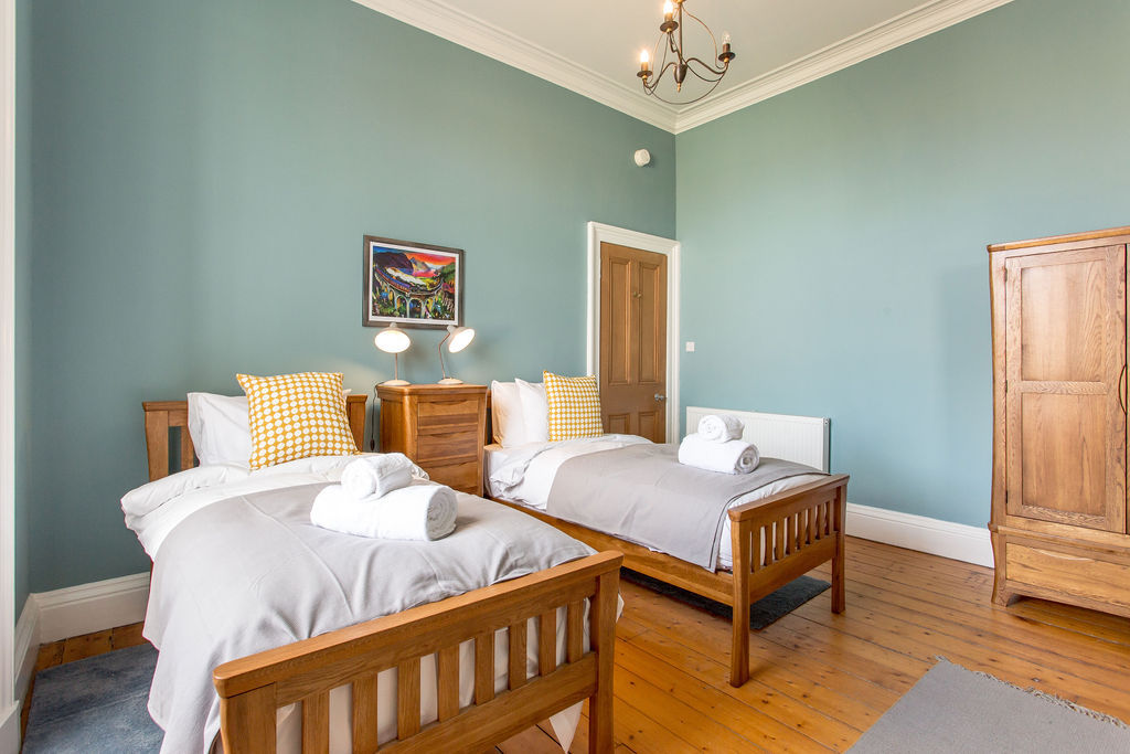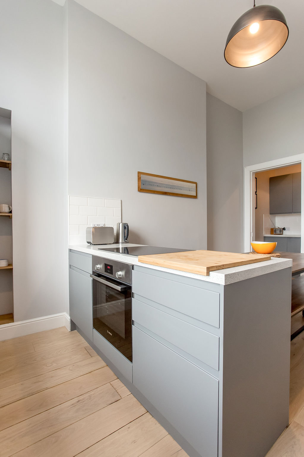 This well proportioned and attractive living space floods with light through the large Victorian windows and is perfect for sitting and relaxing in at any time of the day. The pretty bedrooms are large and airy with super comfy beds and large windows that flood with light. The kitchen is spacious and well stocked with modern quality appliances and a large contemporary table for eating at, or simply sitting and enjoying a glass of wine whilst cooking. Funky art work adorn the walls in the kitchen and elsewhere in the apartment. whilst the bathrooms are an enjoyable place to be with walk in showers, gleaming white tiles and a large traditional bath. The sitting room is huge with large windows at one end and a dining table overlooking the street below. Comfortable sofas and a large flat screen television as well as books and games make this a wonderful space to sit and relax in or enjoy a wee dram or two with family and friends.